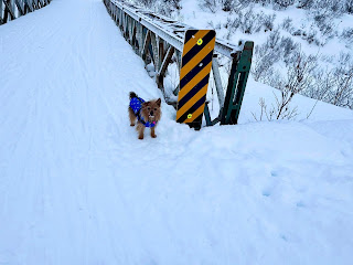 It's been so warm that Skeetawk had to delay its December 13th scheduled opening day. It was 37 degrees here this morning. I wanted to go somewhere and do some skiing plus get Bella out on snow to try out her new suspender booties. They are very hard to get on her because there is a stiff seam inside each bootie where it attaches to the leg portion. Her toenails tend to get stuck on that seam. Measurements indicate I have the right size, but they are so difficult to get on her that I may be better with the next size. Once they are on, they look fine. But today was the second time I tried her wearing them on snow. Just like the previous time, she walked a short distance then came to a complete stop. I thought she looked uncomfortable walking in them too. So, I took them off and let her run without them. She seemed fine and we went all the way to the bridge and back. 4.5 miles round trip. I brought my new pack in case I needed to carry her. But I decided to just leave it in the car. I used my dog mushing belt to attach her leash, which works much better than attaching it to my backpack strap. She broke the waist strap off my other pack, so I let it go. It would have been hard to repair plus I really didn't like that pack. It was very uncomfortable. This one is much lighter, and she seems to like it. But I knew I wouldn't need to carry her on a warm day like this one. The snow was pretty icy at the start, but did soften up after the first half mile. It turned out to be a great day to ski and I'm so glad I decided to go. I learned that those dog booties have to go, and that I need to use my skate skis if I want to improve my skate skiing. It is much harder on classic skis. Maybe tomorrow I'll take the skate skis up there and try it again.