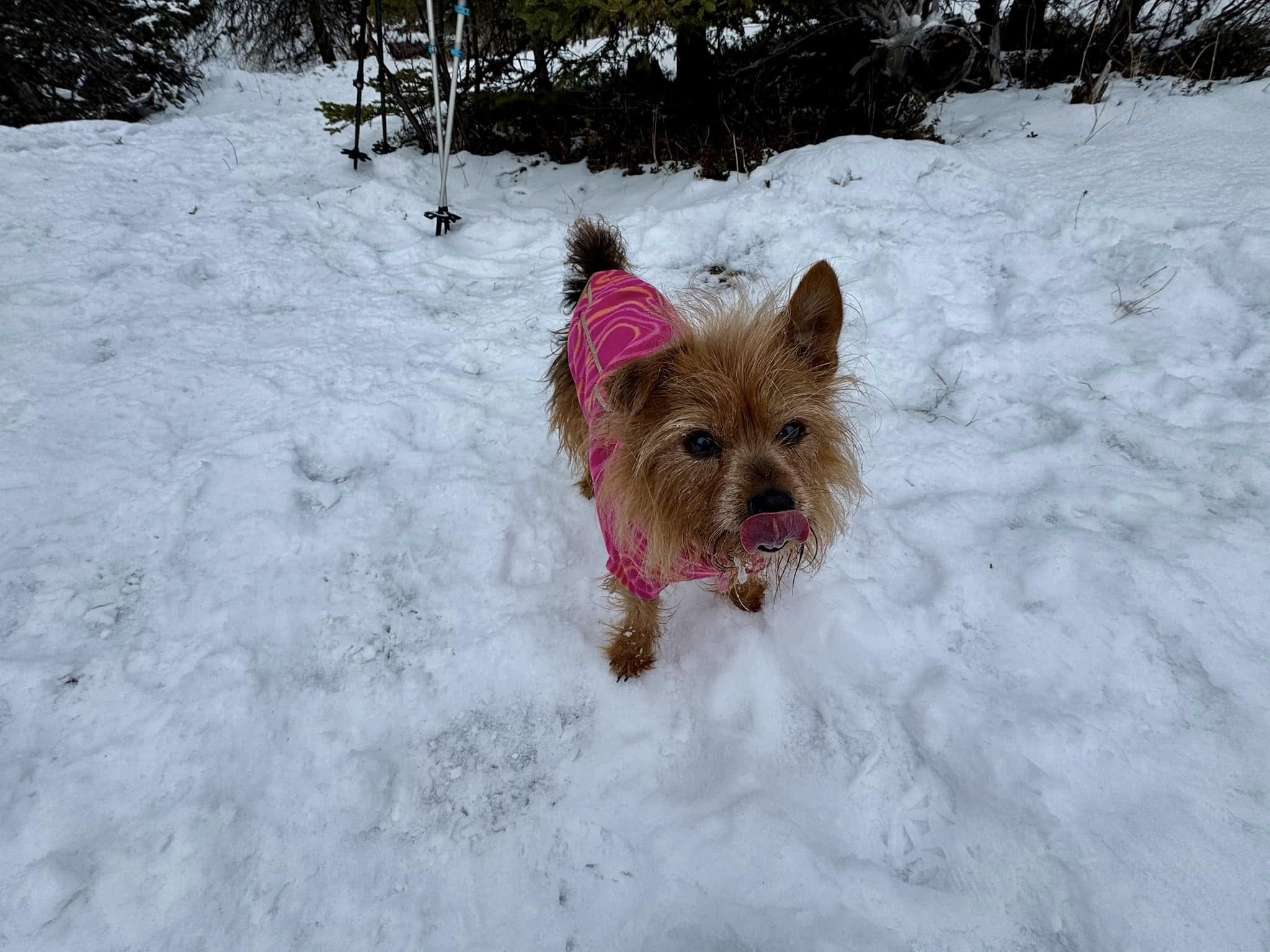 I hiked up to Bear Point with a couple of the Valley Wanderers. Initially it was only going to be Kim and me. But Kim brought Amy, a friend of hers, and Chris showed up at the trailhead unannounced like he usually does. It was a perfect day for the hike. Nice temperature and no wind. Bella ran ahead with Chris who was up in front, as usual. He finally got too far ahead so I had to keep Bella back with us 3 ladies. Amy said it was her first winter hike. Wow, I thought, what a tough hike to introduce someone to winter hiking. The snow wasn't too deep, so we never needed snowshoes. But it's a very steep trail and in many places, it was also a very icy trail. I was glad that my micro spikes are very new and still quite sharp. Even so, at times it was pretty treacherous even with them. There has been enough foot traffic that at least we didn't need to break trail on our way up. But we did need to divert around some particularly icy spots. When we got closer to the top, Bella took off running, so she could greet us when we arrived. She is quite the climber. We finally saw Chris once we reached the first part of the summit plateau. He had gone much farther over towards the official Bear Point and had come back to see where we were. We followed his tracks to the official high spot labeled Bear Point on the map. We took a nice break there and had some snacks and took the usual photos. It wasn't obvious how to get back to the route we had taken up and we just trekked back across the snow in the general direction. Chris was ahead and the 3 of us followed him. Finally, we decided he must have some other route planned because we were obviously not headed back to the official trail. He does like to do his own thing sometimes. I checked my AllTrails app and saw that we needed to make a hard right to get back to the official trail. So, we worked our way back and Bella found our old footprints. She is a great scout. We could see Chris way off to the left towards Mt Eklutna and at first, wondered if he planned to climb it. But he did finally turn down in our direction and eventually showed up behind us on our original trail. I always worry that we may have trouble going down, after a steep icy climb up. But we easily found safer ways down avoiding the worst icy spots. Bella tends to stay with me on the way down, so she was close by until we reached the Peter's Creek Trail. We all got back to the cars together. It was a beautiful 4-mile 3-hour hike.