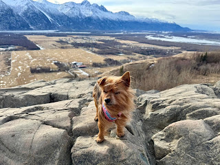 Hiked up the West Butte Trail today with Mark. I considered hiking with the Walkabouts on the Crevasse Moraine Trail, but it was so muddy and icy yesterday that I decided to opt out of that option. Bella was so muddy yesterday from walking that with Pam, that I had to carry her immediately to my kitchen sink and give her a bath. I actually find that trail a bit boring anyway. The last time I climbed the Butte it was quite snow-covered and comfortable wearing micro spikes. So, I asked Mark to go along and check it out. Now the bottom half is no longer snow, but solid ice. I brought my spikes, and it wasn't long before I sat down and put them on, Maek was carrying his and did make it all the way to the top without them. But he put them on at the bench below the stairs on the trip down. The stairs were mostly clear, but I just left spikes on the whole way. Weekend days can get pretty crowded, so I kept Bella on her leash the whole way. In icy conditions, that can be suicide for me with her pulling the whole way. We did encounter quite a few dogs. I usually picked her up while she barked constantly until we were well past them.